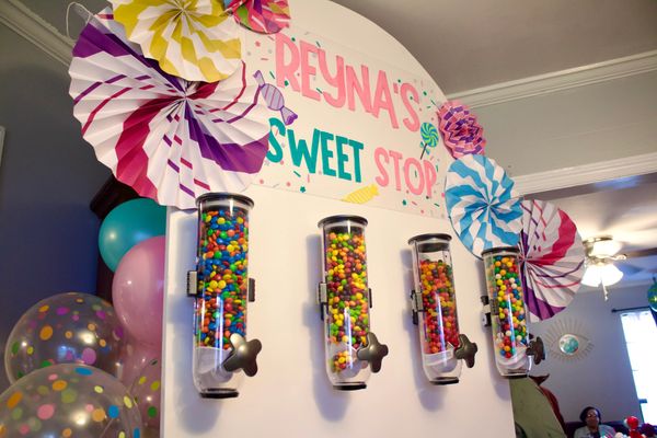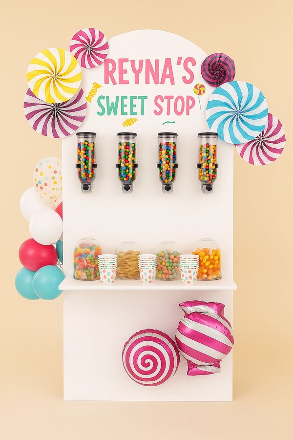 Our customizable candy wall is the perfect pop of fun for birthdays, showers, weddings, and any celebration that needs a little extra sweetness. With four clear candy dispensers, shelf space for extra treats, and a topper you can personalize with your own theme or name—it’s a total crowd-pleaser.